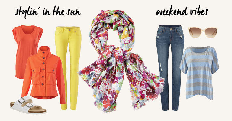 STYLIN’ IN THE SUN: Flora Scarf, Resort Jacket, U-Neck Tee, Citron Skinny, Birkenstock Sandals