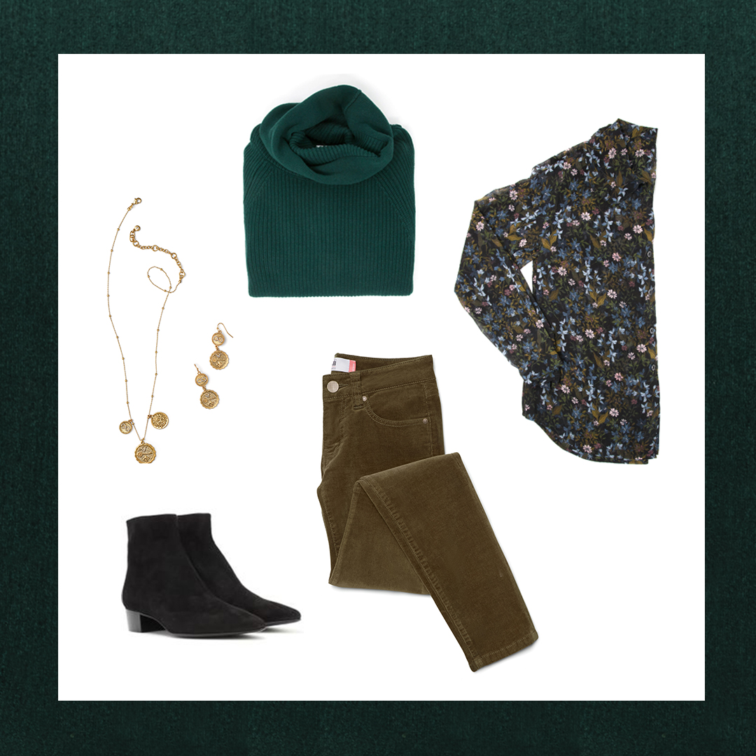 Featured Items: Cowl Pullover, Floret Blouse, Skinny Cord, Apollo Necklace, Apollo Earrings