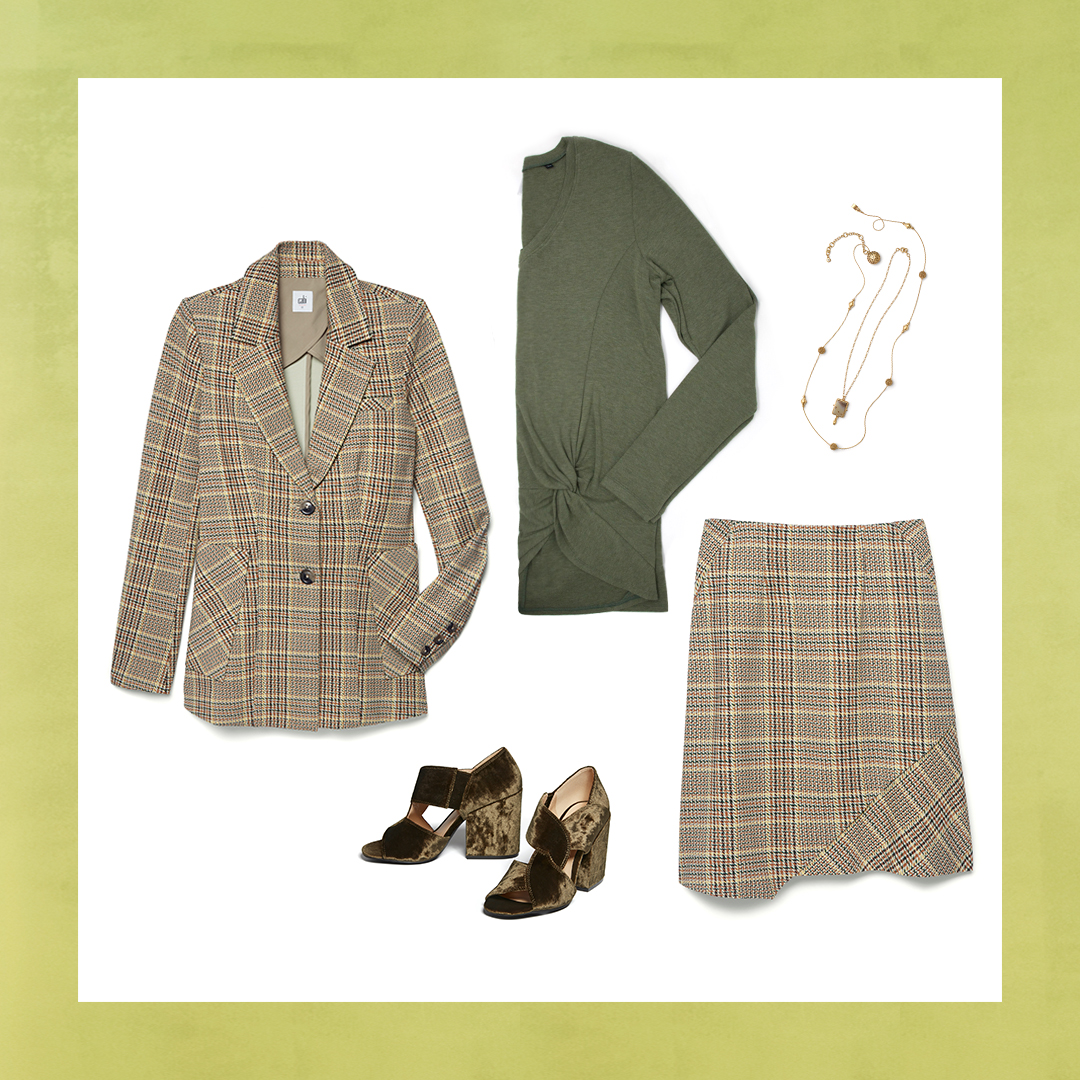 When it comes to this new trend, it’s so easy being green! Reach for the delicate olive hue of the Reveal Tee as a neutral anchor against the bold plaid print of the Pastime Skirt and Jacket—a kind of modish high-low twist that makes a powerful statement.