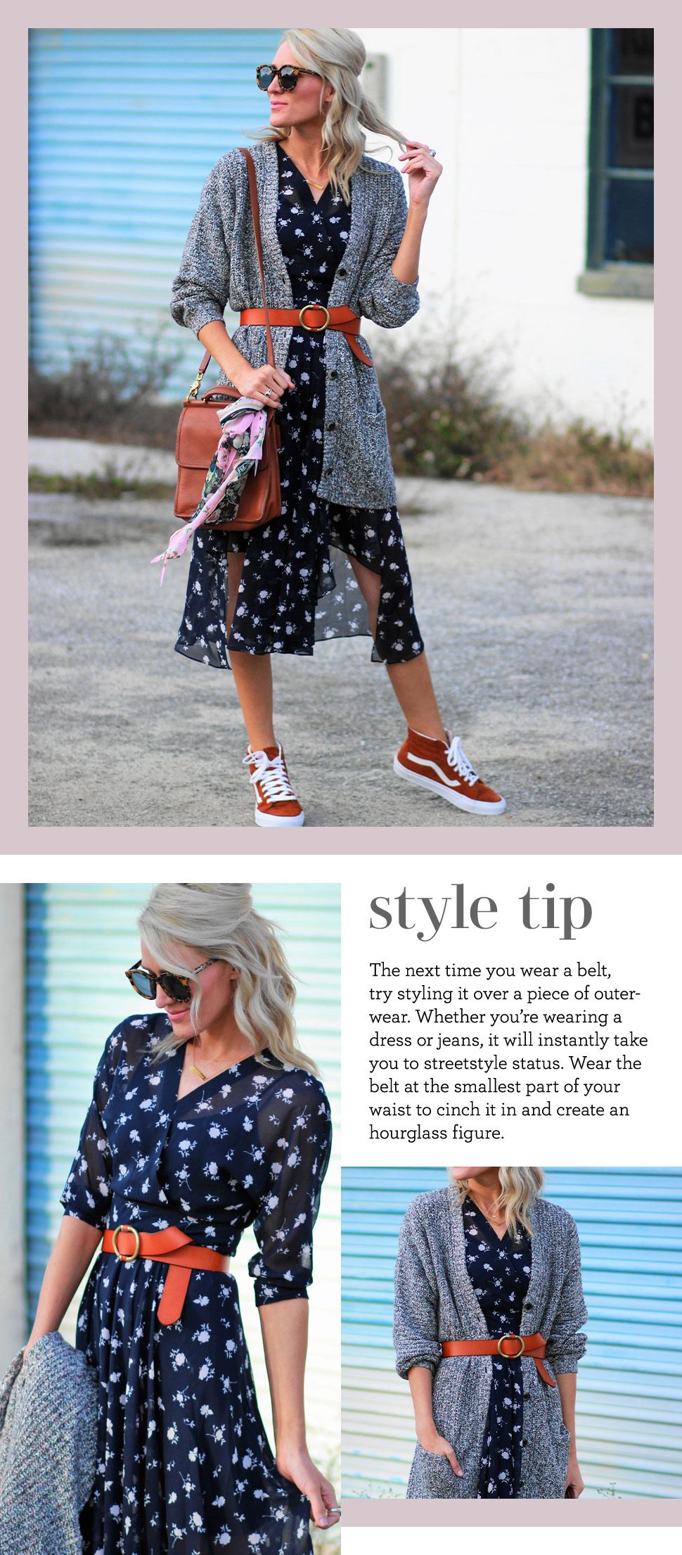 Dresses are surprisingly one of the easiest pieces to transition through the seasons. You can get a lot more wear out of your spring and summer dresses by simply adding a cardigan or jacket and a closed-toe shoe. The Dream Dress from the Spring 2019 Collection is so pretty, I just couldn’t wait to style it, but I wanted to pair it with some cozy outerwear to keep myself warm in the cold February temps. The Embrace Cardigan from the Fall 2018 Collection was the perfect solution. I love the juxtaposition of the feminine dress with the oversized cardigan. The combo gives off a tomboy chic vibe that’s so stylish, especially when paired with a cute sneaker!