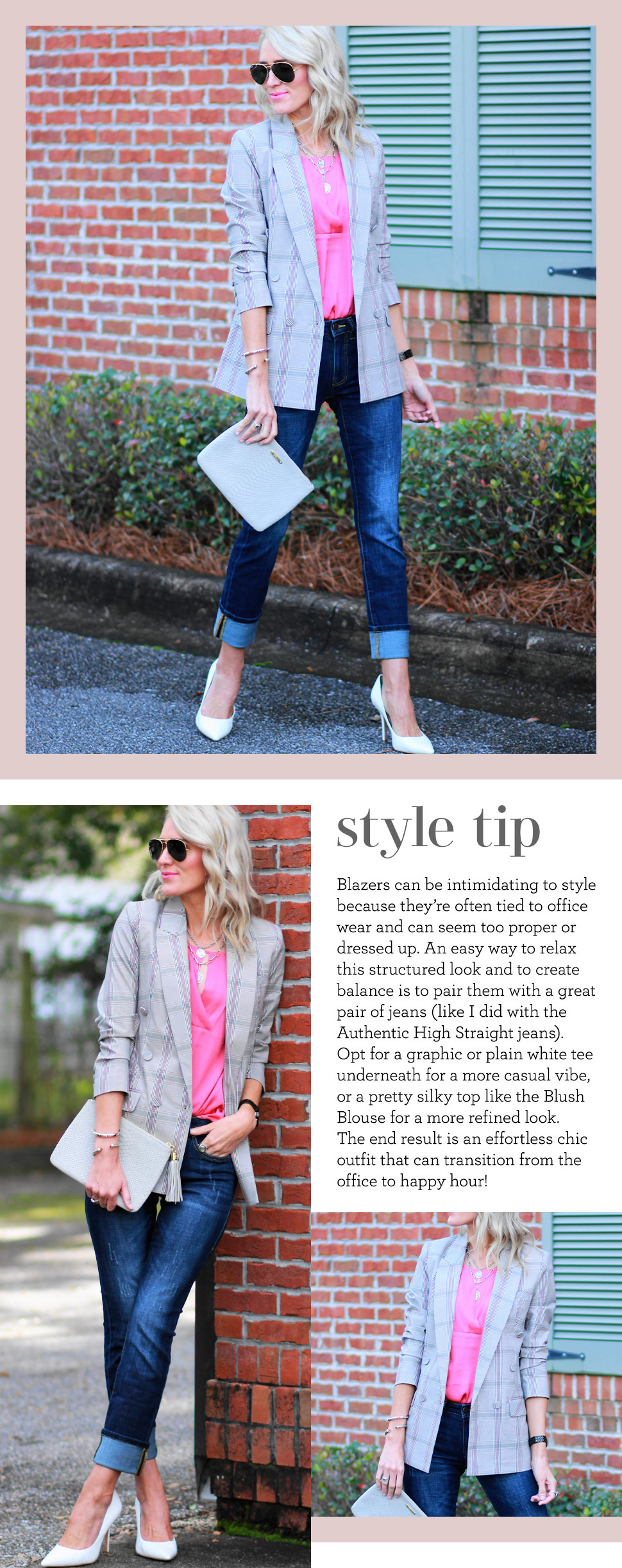 Featured Items: Sleuth Blazer, Blush Blouse, Authentic High Straight, Triumph Necklace