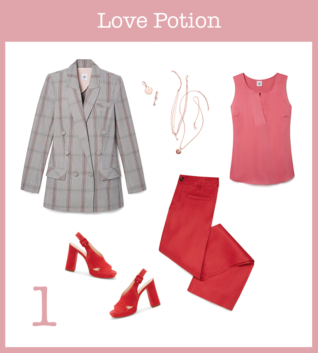 Fall in love in this sleek red and pink outfit featuring our bright Valentine Trouser and darling Blush Blouse. The red hue will really make the stitching pop in the blazer. Take this amorous color palette a step further by adding rose gold jewelry for a final pink flourish.