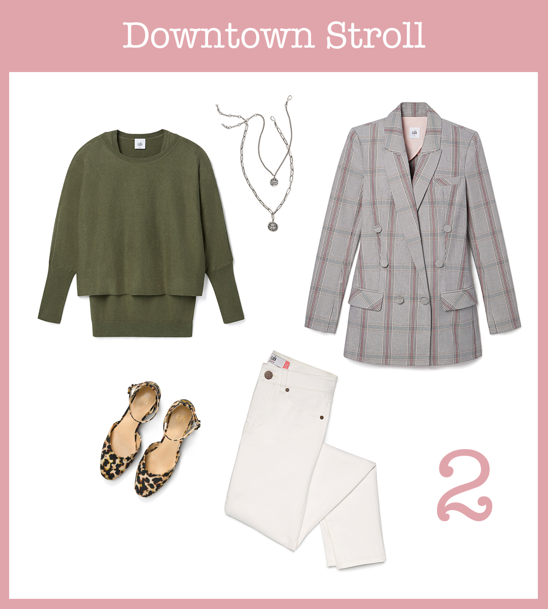 Treat the blazer as a light jacket come spring in this neutral tone, city-chic look. The olive Twofer Pullover is the perfect fall-to-spring pick because you can peel the top layer off as the weather gets warmer. A skin print ankle strap against a white skinny jean will be the perfect final touch.