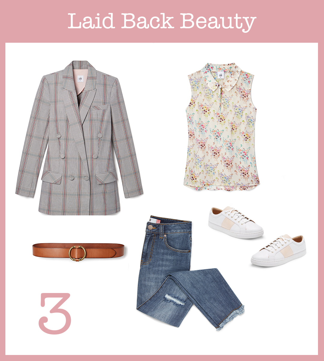 Try this effortless yet striking ensemble featuring our floral Essential Blouse paired with a distressed straight jean. Button the blouse up the front and belt the blazer closed for both a funky silhouette and a mix of prints that’ll peek at the collar, done and done. Add a cute leather sneaker and you’re golden.