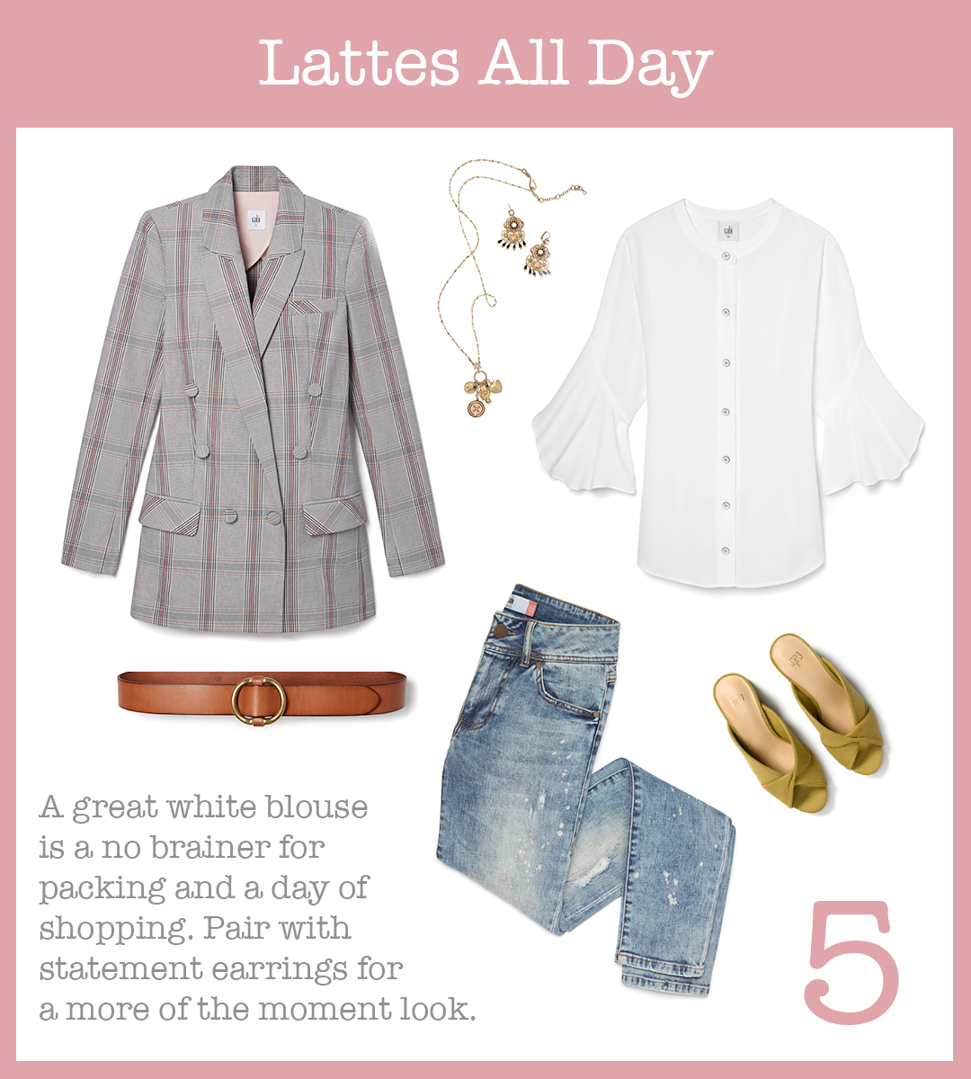 Featured Items: Sleuth Blazer, Float Blouse, Cinch Skinny, Safari Belt, Cha Cha Earrings, Cha Cha Charm Necklace, Marigold Mule
