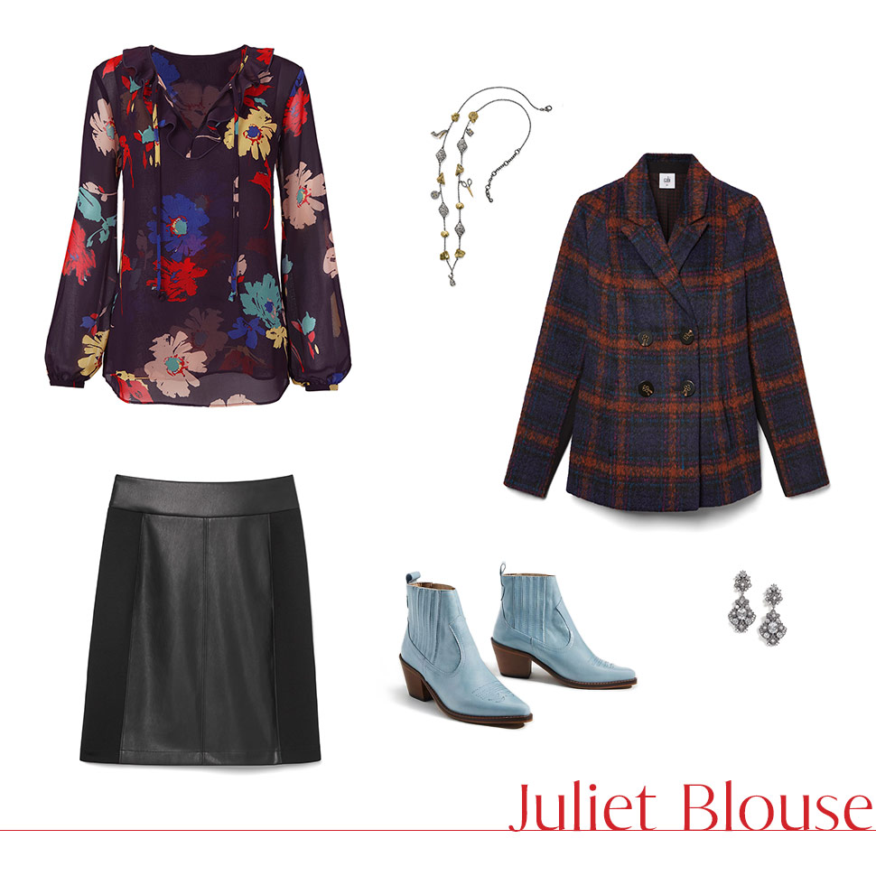 Mix your prints and don’t look back! Pair our floral Juliet Blouse with a plaid jacket and a sleek, black pencil skirt. Pick a color in the blouse to match to your shoes…that’s what the pros do.