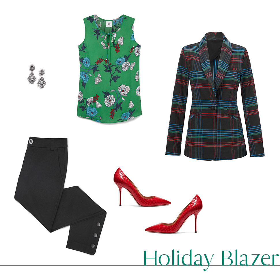 Hosting a holiday party this season? This polished look is the perfect hostess pick. Go for the bright Primrose Top paired with the black Evening Trousers. Throw on the Holiday Blazer for some festive pattern mixing!