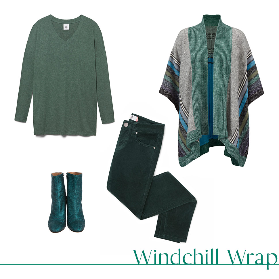 A clean, green palette is a great base for a striped topper. Play off the colors in the Windchill Wrap with our hunter Skinny Cord and heather pine Serenity Tee. There’s no such thing as too much green!