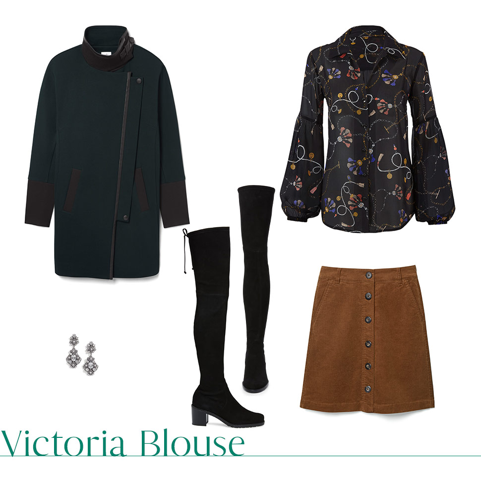 A corduroy A-line skirt paired with the new Victoria Blouse offers a cute spin on professional attire. Add some over-the-knee boots and our sleek Renaissance Coat—now all this outfit needs is your favorite novel in hand!