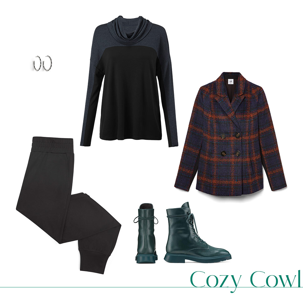 Throw on some pumps and a chic topper to dress up an otherwise casual ensemble. The Cozy Cowl paired with the black Pivot Jogger will leave you feeling oh-so-comfortable, while the Checkmate Jacket and a printed pump add edge.