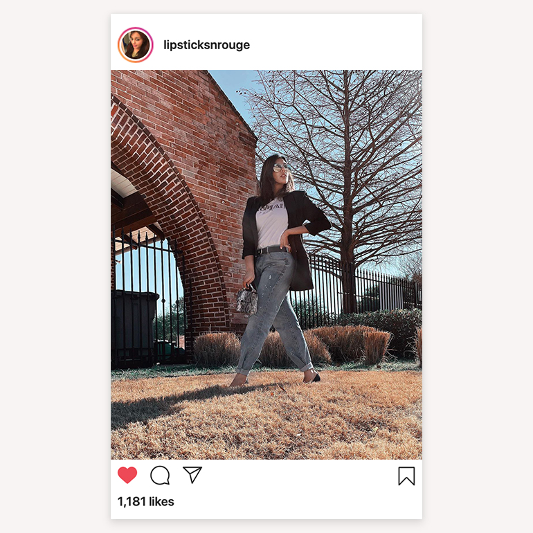 Prerna is wearing our destructed, relaxed-fitting 100% Boyfriend jeans paired back to a black blazer for an eye-catching mix of styles. A T-shirt and a pair of pumps help bring home this fabulously casual look.