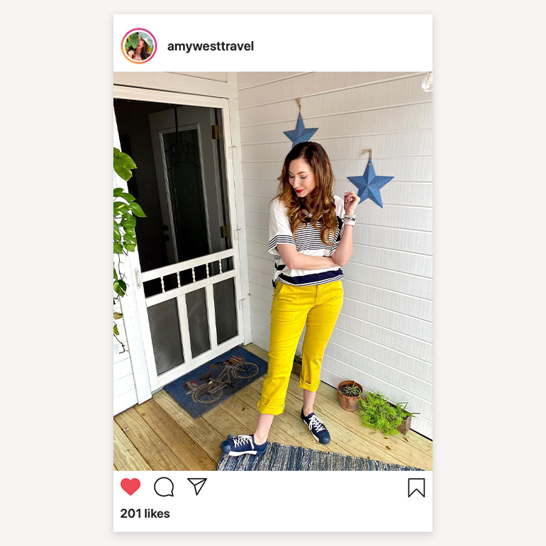 No matter the weather, the Utility Trouser is sure to bring in some sunshine. For her birthday look, Amy styled these vibrant bottoms with the nautical striped Sailor Tee. This outfit is the epitome of “happy vibes,” her words, not ours!