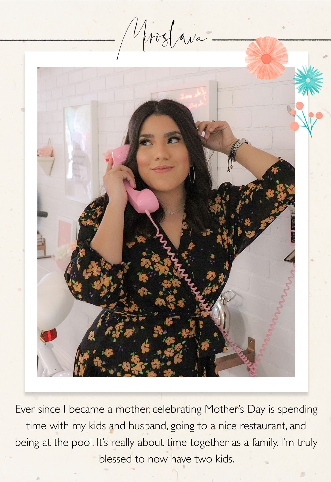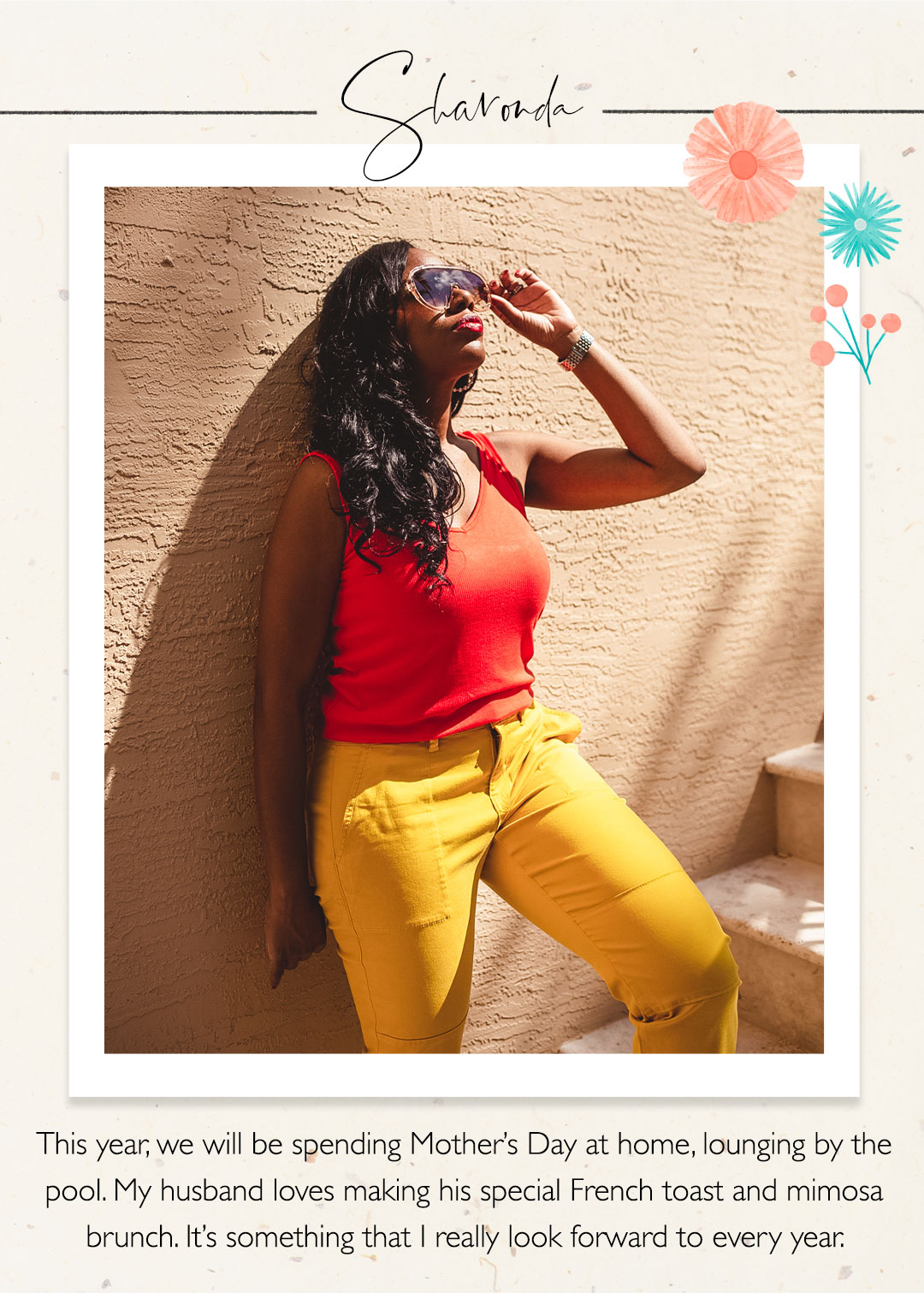 Without further ado, let’s meet our mothers. Miroslava just had a baby, making her a new mother of two! This military wife’s style is urban chic with an emphasis on blacks, reds, and neutral palettes. Sharonda is a mom of three, and as she puts it, “mommin’ is a sport!” She’s got a classic sense of style, but she isn’t afraid to go high fashion. Last but certainly not least is Amy, television personality and mother to two daughters. She loves color, whimsical prints, and flowy silhouettes. Keep reading to discover more about these inspiring mothers and how they’re celebrating this holiday with their loved ones.