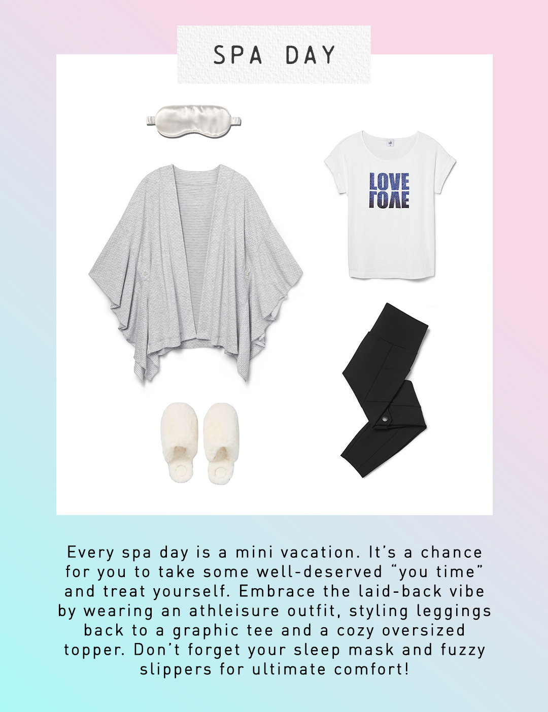 Featured Items: ATC Cape, Love Tee, ATC ¾  Cargo Legging, Sleep Mask, Slippers