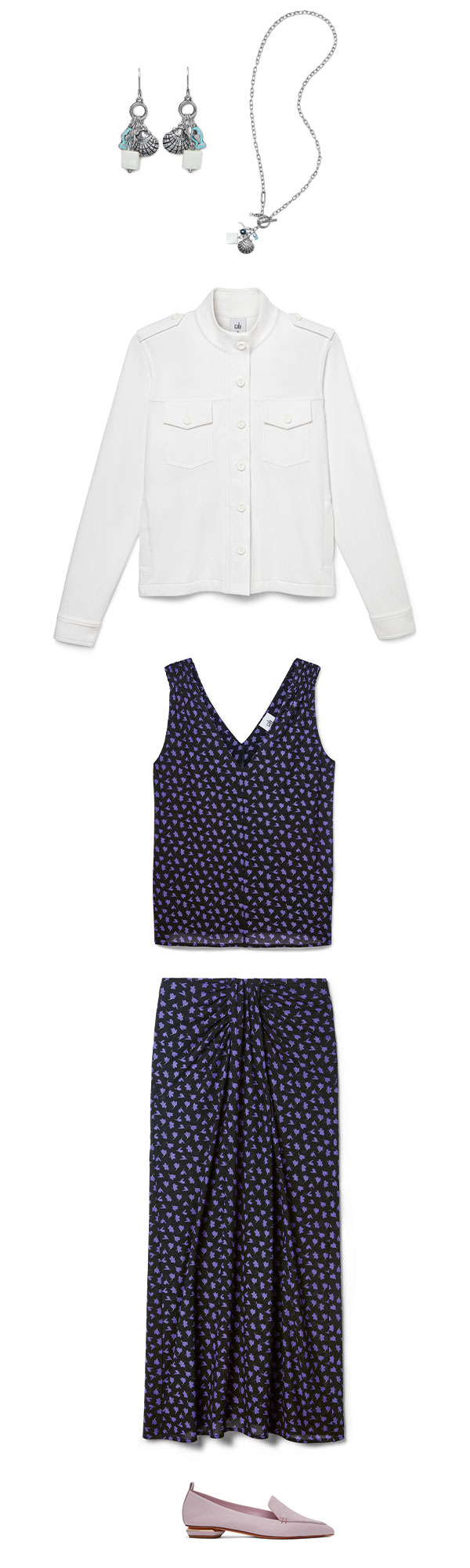 Style Tip: Let the floral print of the Island set pop against a white jacket, then style back to charm jewelry, like the whimsical Harbor Earrings and Necklace