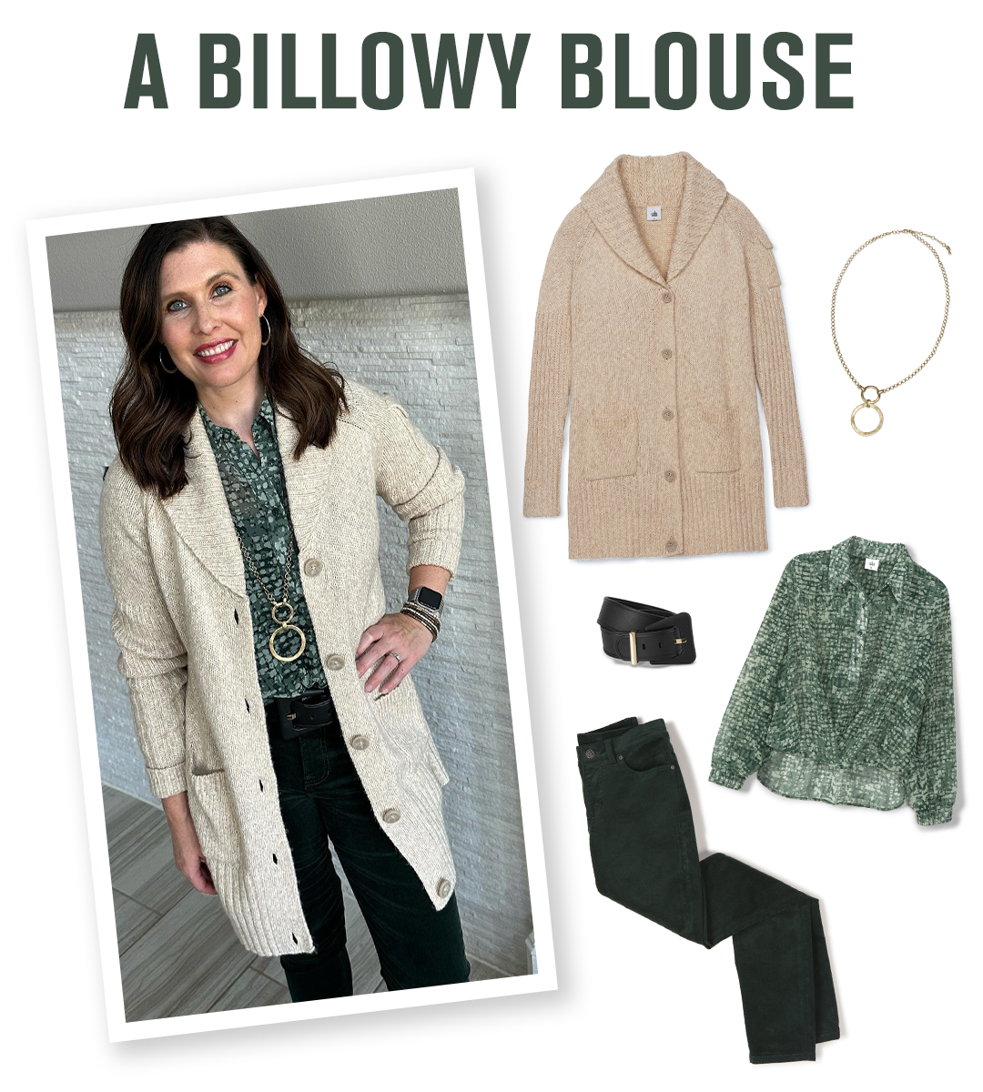 Featured Items: Steady Cardigan, Caliber Blouse, Boss Belt, High Skinny Cord, Flashback Necklace