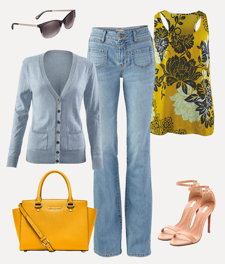 Billi Cardigan, DVF Sunglasses, Michael Kors Handbag, Malibu Flare Jean, Bali Floral Tank, Shutz Sandals