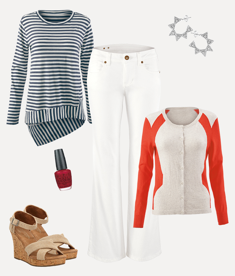 Bengal Stripe Tee, TOMS Wedges, OPI Nailpolish, White Wide Leg Jean, Hourglass Cardigan, House of Harlow Earrings