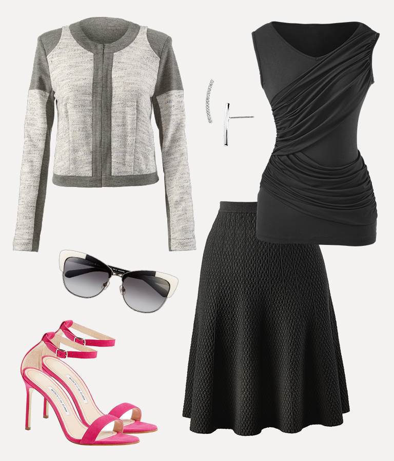 Shrunken Blazer, Manolo Blahnik Sandals, Kate Spade Sunglasses, Amelie Skirt, Nadri Earrings, Sleeveless Double Drape Tee
