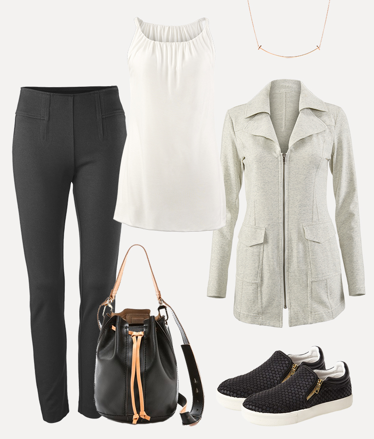 Tiffany Pant (Black), Ramy Brook Bucketbag, Fifth Avenue Tee, Foldover Collar Jacket, Tiffany & Co. Necklace, Ash Sneakers