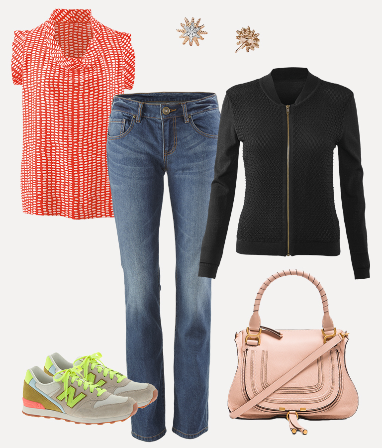 Printed Madeleine Top, New Balance Sneakers, Laguna Wash Slim Boyfriend, David Yurman Earrings, Bomber Sweater, Chloe Purse
