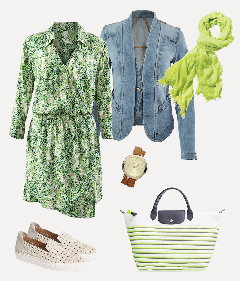 Leaf Print Dress, Rachel Zoe Sneakers, Jeanie Jacket, Michael Kors Watch, Longchamp Tote, Pop Scarf