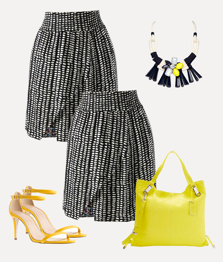 Reversible Wrap Skirt (wear as a top and bottom on the black-and-white polka dot side), Vince Camuto Tote, Weekend Max Mara Necklace, JCrew Sandals