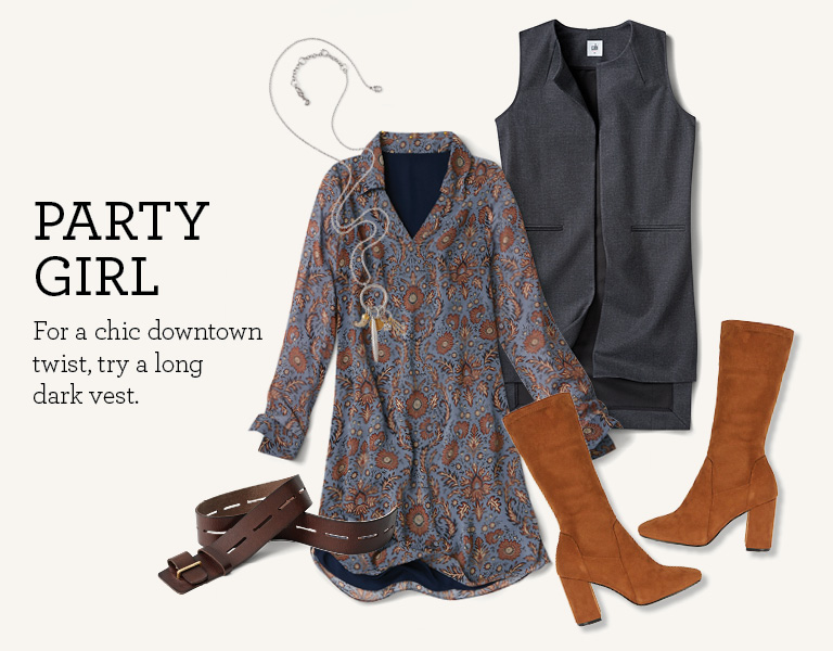 GET THE LOOK: Provincial Dress, Drafting Vest, Here or There Belt, Chelsea Charm Necklace, River Island Light Brown Stretch Calf High Boots