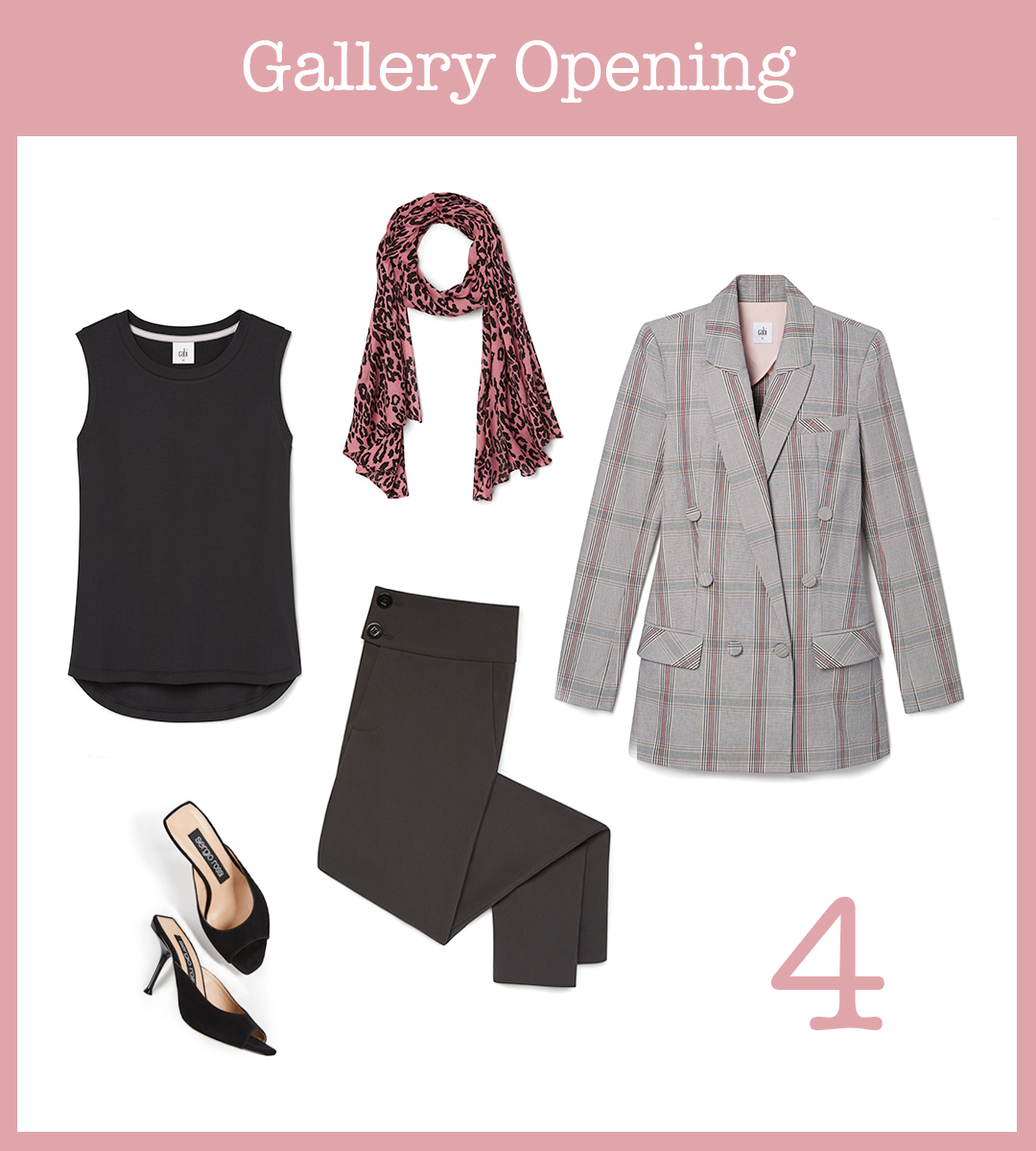 In this outfit, you’ll be dressed to the nines and feel like you’re on cloud nine. This sophisticated, all black ensemble features our comfy Center Easy Tank and our stretchy Hero Trouser. Add a matching black slip-on heel and our Wild Scarf for a pop of print, and you’ll be a work of art!