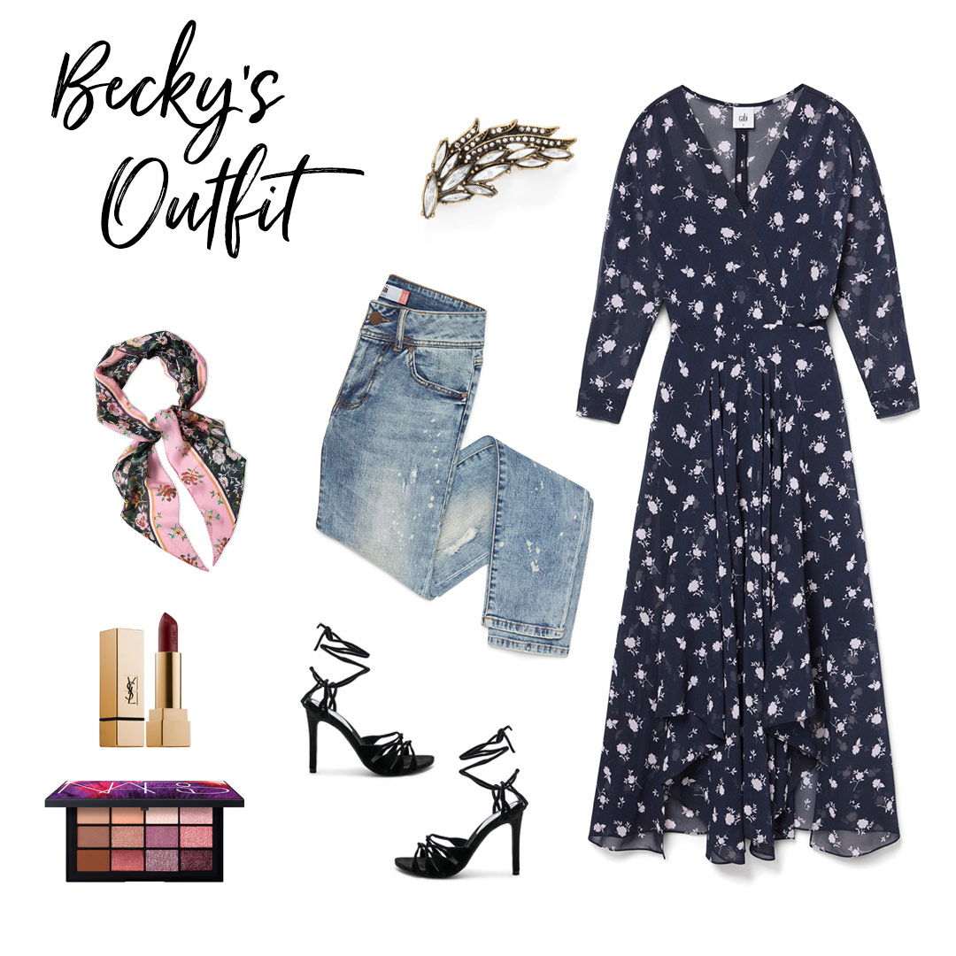 In case you haven’t caught on yet, cabi ladies are all about accessories, and Becky’s no exception. She likes to cluster brooches and often goes for the “blingy” ones (who doesn’t love a little glitz?). Brooches provide a unique statement accent that women often forget are at their disposal. Even a simple, clean lined jacket can be easily dressed up with brooches. Heels, as we all know, are an easy go-to to take an outfit from casual to dressy. Try playing with your makeup as well—a hint of shimmer can go a long way. Becky suggests a little shine in either your eyeshadow or your lipstick…but not both. Pro tip: Etsy sells fancy shoe clips that can be added to a bootie, for example—it’s like earrings for your shoes! Need we say more?