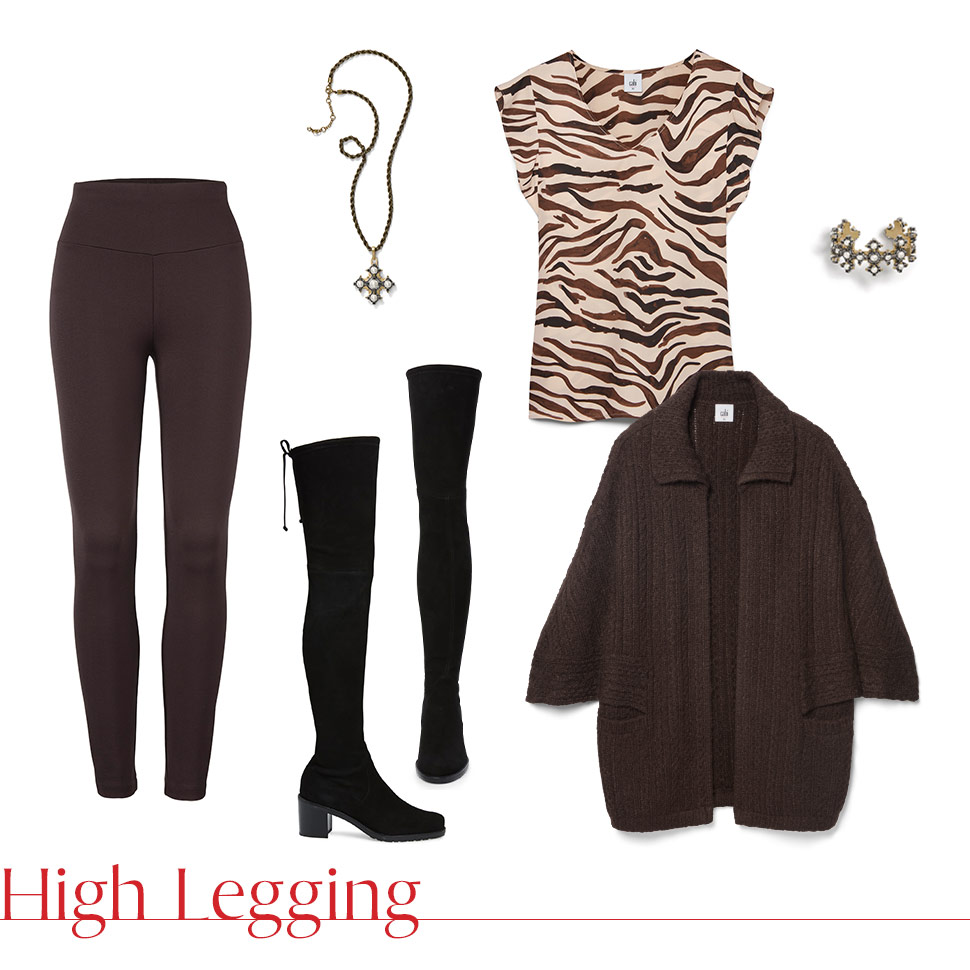 Brown is all the rage this fall. Think of it as a contemporary replacement for black in your wardrobe. Style the new ganache-colored High Legging with our drapey Repose Cape and the Zebra Top for a pop of animal print. Add drama to your look with some over-the-knee boots.