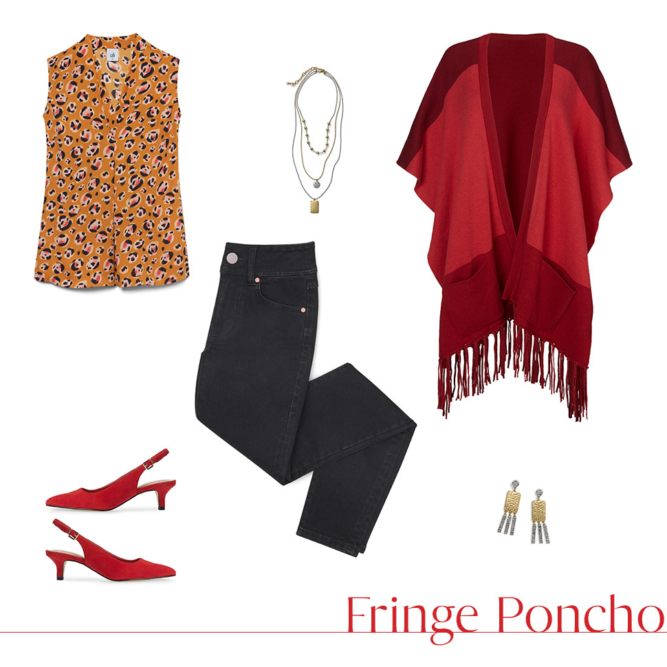 Featured Items: Fringe Poncho, Prowl Top, Cinch Skinny, ID Earrings, ID Trio Necklace, Slingback Pumps