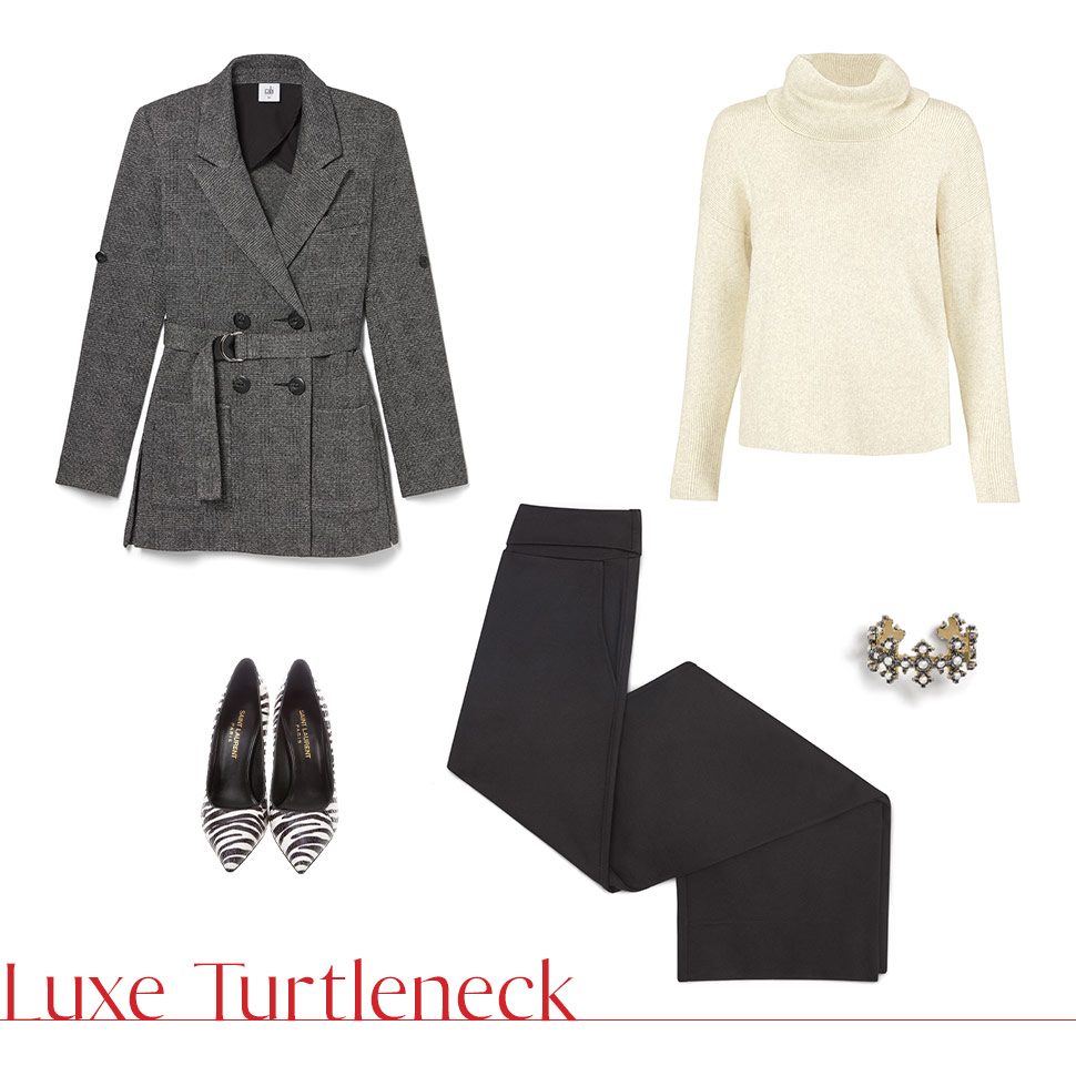 Featured Items: Luxe Turtleneck, Bond Blazer, Chance Wide Leg, Tudor Cuff, Pumps