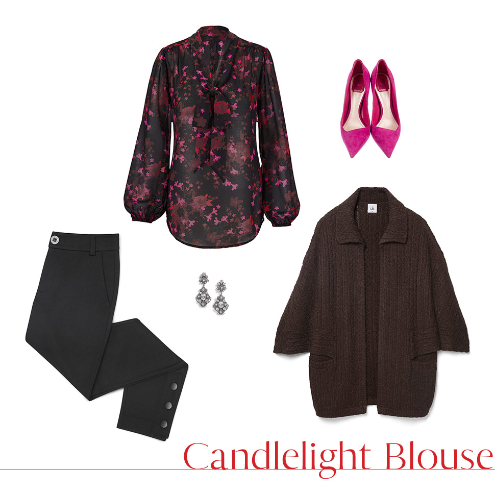 Featured Items: Candlelight Blouse, Repose Cape, Evening Trouser, Mystic Earrings, Pumps