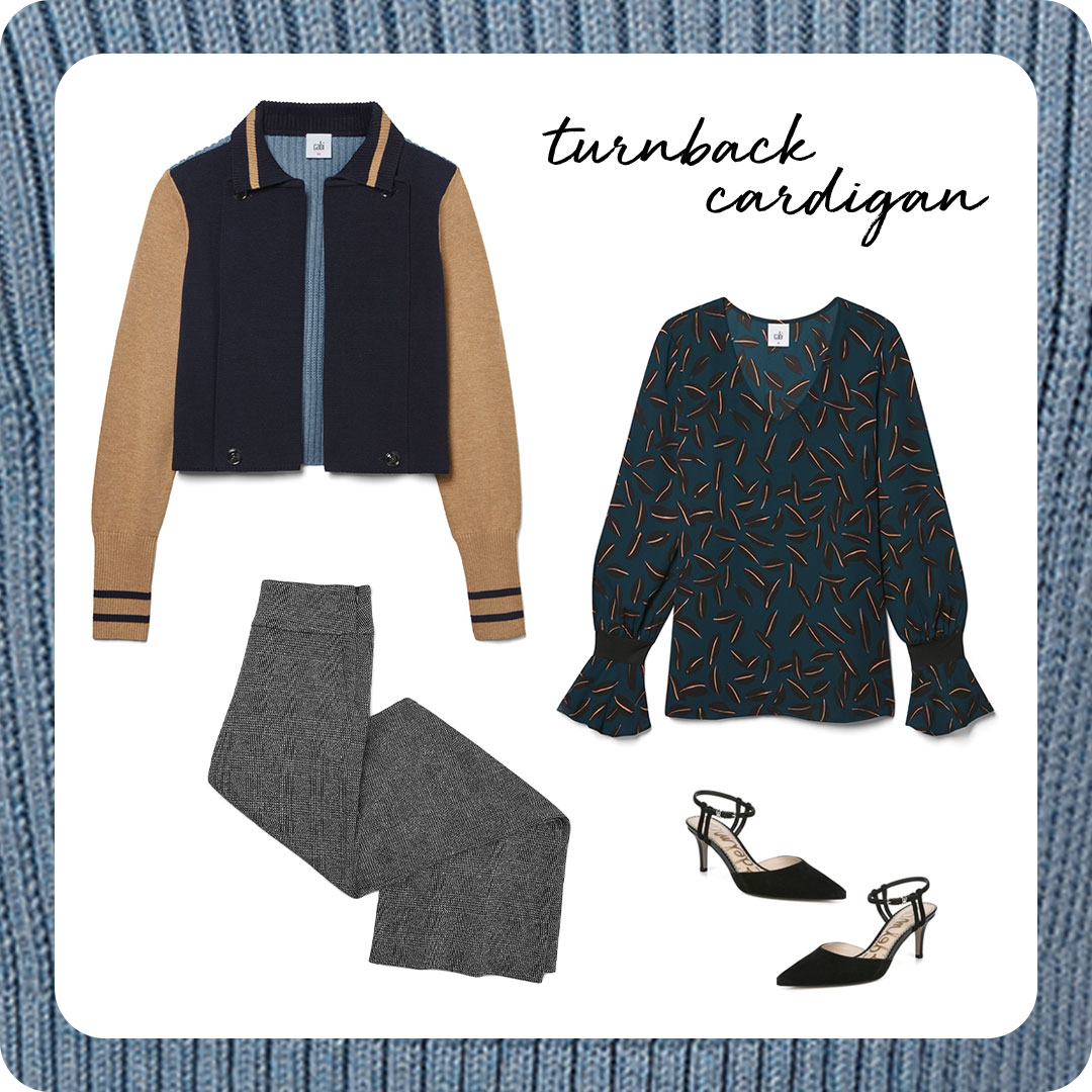 Featured Items: Turn Back Cardigan, Shadow Leaf Blouse, Bond Trouser, Kitten Heels