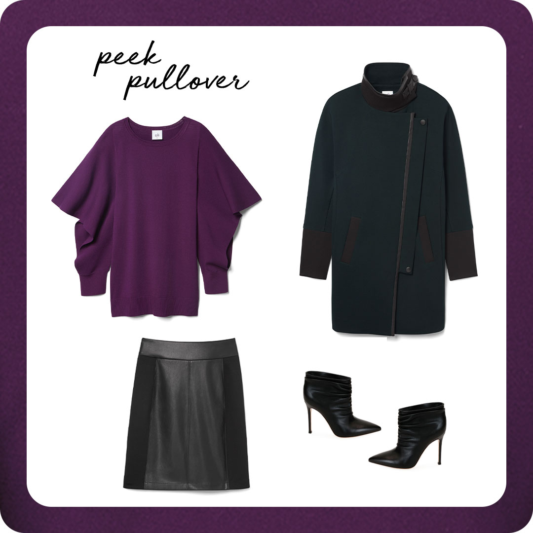 Try a color-block look this fall to fit right into the Gem Tones trend. The violet Peek Pullover pairs beautifully with the hunter green Renaissance Coat and a leather skirt for a super-sleek outfit. Style this look with black tights to keep you warm.