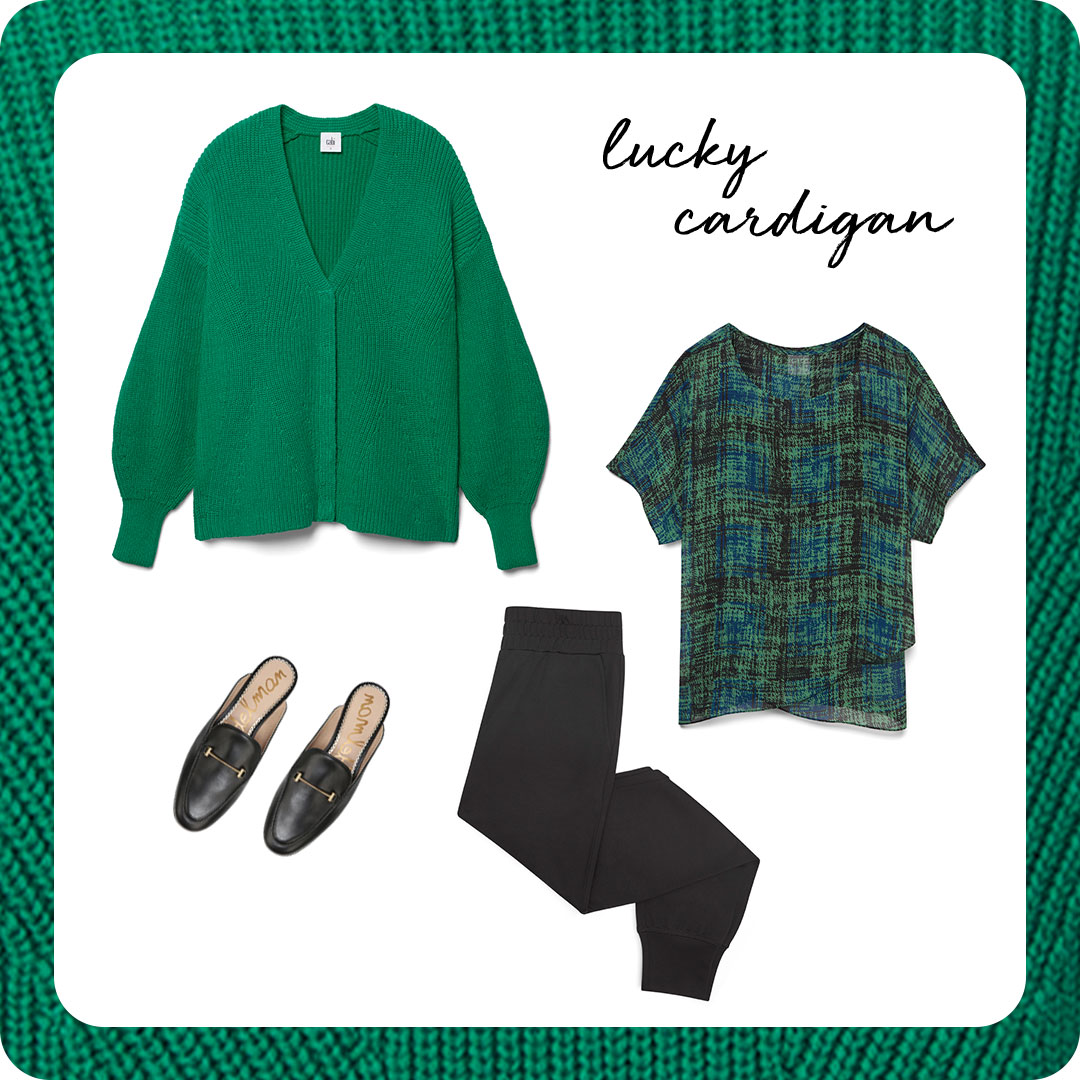 Pick a printed top and match one of the hues to your cardigan. The emerald Lucky Cardigan paired with the blue and green Paradox Top makes for a striking duo. Try this look with some loafer slides (the closest you can get to wearing slippers in the real world!).