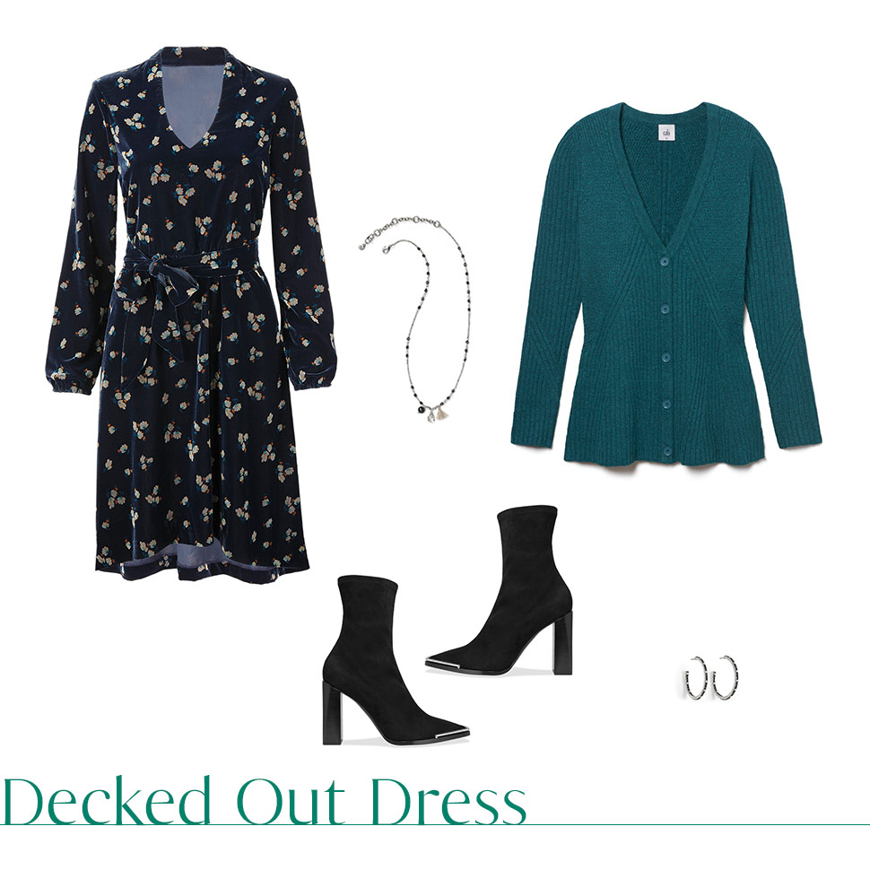 Featured Items: Decked Out Dress, Deco Cardigan, Jet Hoops, Jet Necklace, Boots