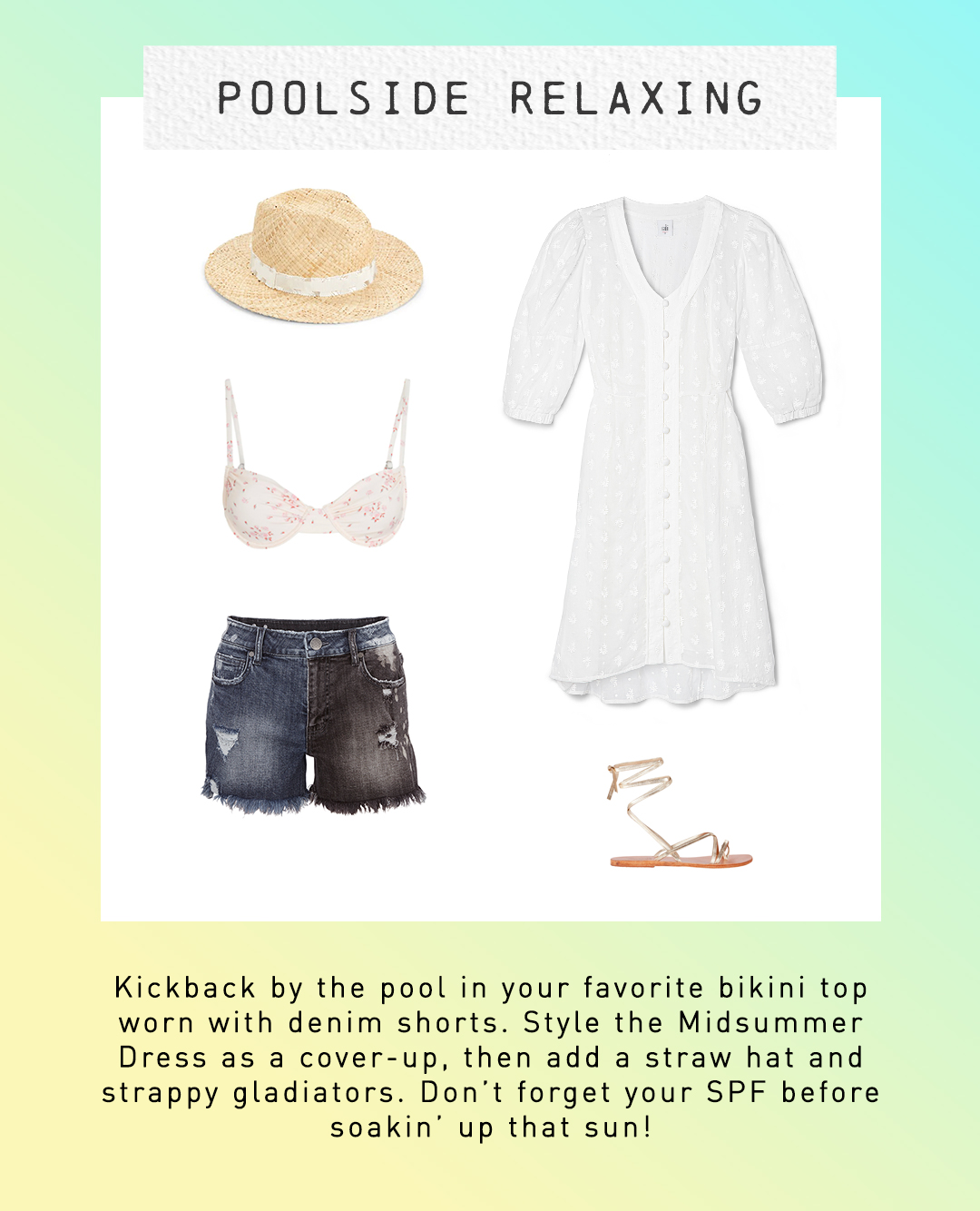Featured Items: Midsummer Dress, Bikini Top, Park Short, Sandals, Hat