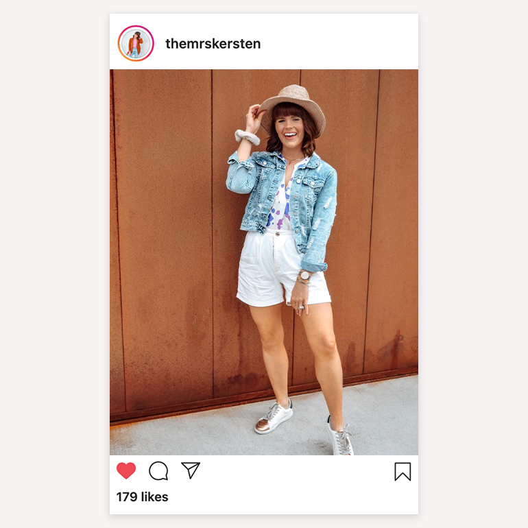 Brooke is rocking her casual chic style in the Violet Top, a light and airy floral top that’s perfect for the warmer months. She styled back to white shorts and a cute denim jacket so the pattern of the top can really pop. Take a look at the other accessories that went into her final look!
