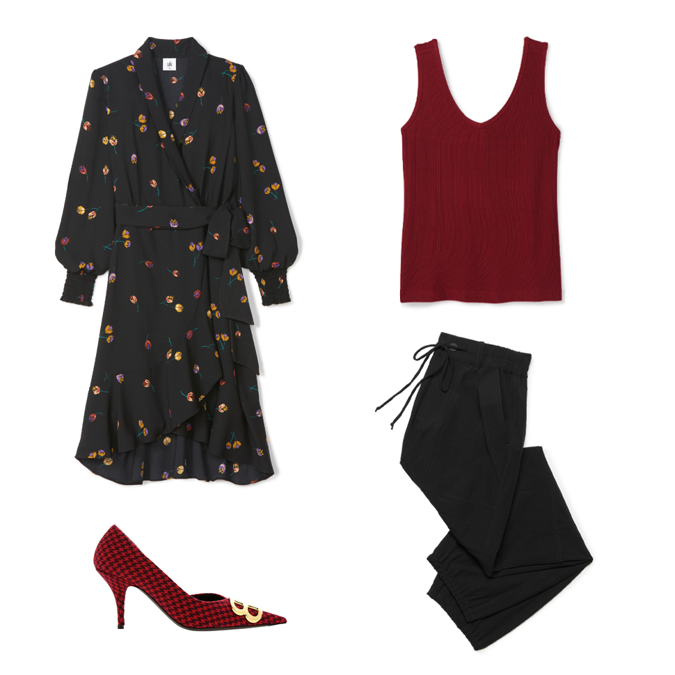 Black and red complement each other beautifully—always have, always will. Style the solid scarlet Cavalier Cardigan fully buttoned as a blouse, then layer on the red plaid Evita Coat for added dimension.